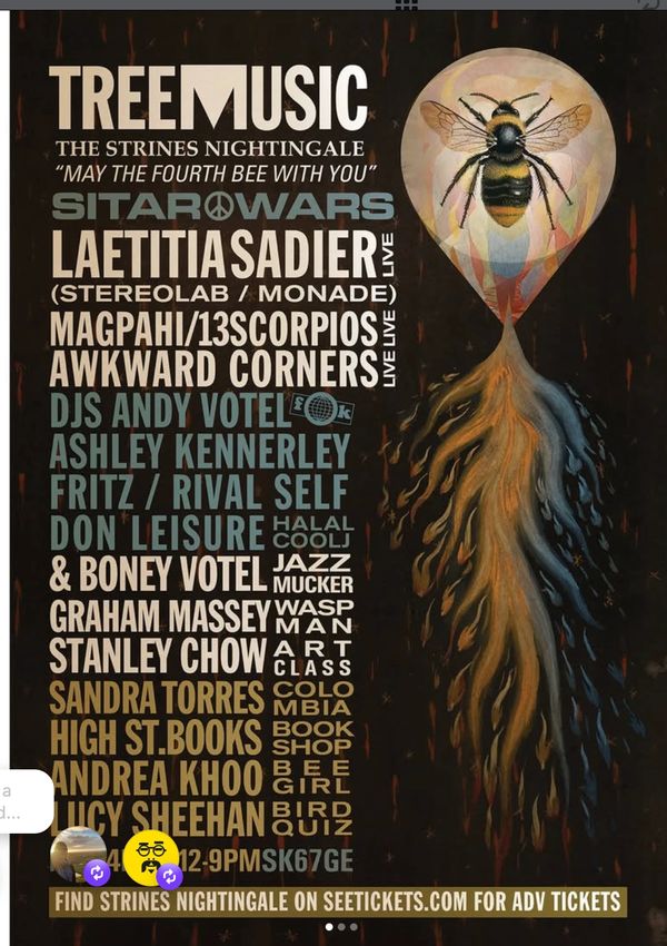 MAY THE FOURTH BEE WITH YOU 🐝 Very excited to announce the 11th edition of TREE MUSIC at @strinesnightingale on May bank-holiday Monday. Stereolab’s inimitable front-woman will visit our woodland auditorium while we explore more Colombian magic realism, the inner workings of a bee hive with a Space jazz vinyl soundtrack and a bespoke Bollywood soundalike quiz. Plenty of lesser-spotted live acts and instrument demos, will join our global-folk DJs and spoken word intervals while we attempt to recreate an Ewok village and scenes from “Turkish Star Wars”… possibly around a Maypole… did I mention the drawing competition? Negligible astronomy umpires will be at hand at all times. We’ve got four weeks to plan it! BUY TICKETS TO AVOID DISAPPOINTMENT. It’s gonna be… unique! 💚🍃🍁🍂🪐🛸